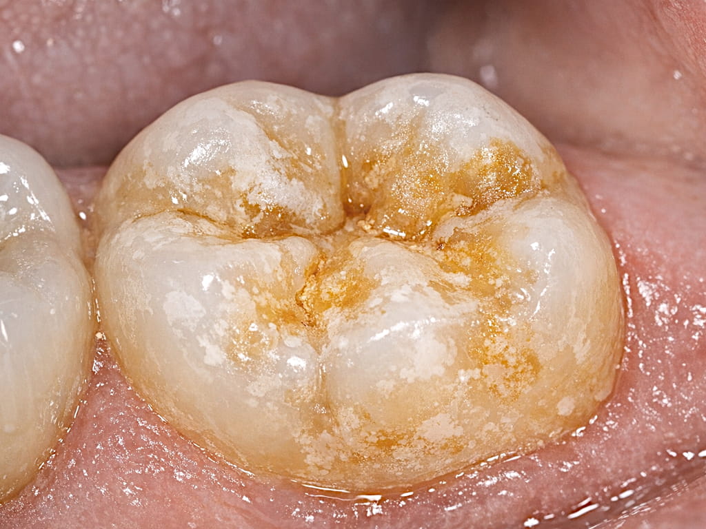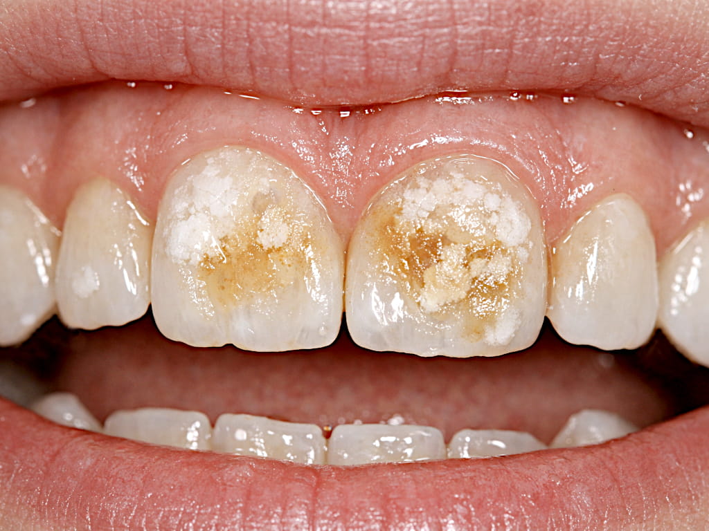 Typisch sind auffällige Flecken auf der Zahnoberfläche. Diese können ganz unterschiedlich aussehen. Manche Stellen sind kreidig weiß, andere eher gelblich oder bräunlich. Oft wirken die betroffenen Bereiche weniger glänzend als gesunder Zahnschmelz.