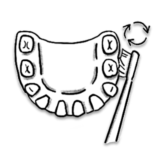 Bei weit geöffnetem Mund werden erst die oberen und dann die unteren Kauflächen geputzt.
