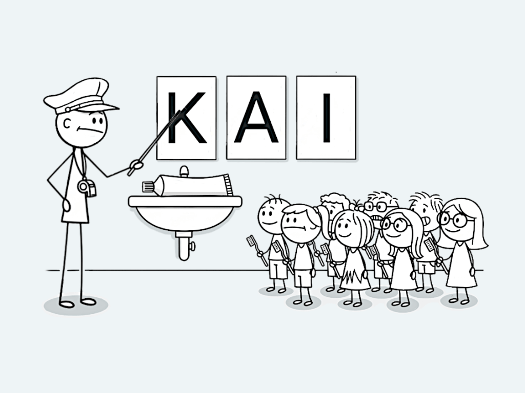 Die KAI-Zahnputz-Systematik steht für Kauflächen, Außenflächen und Innenflächen und nimmt Kinder mit auf eine klare, vorgegebene Putzreise durch den Mund.