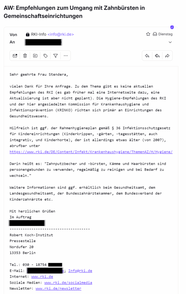 In der Vergangenheit (ca. 2012) hatte das Robert-Koch-Institut „Empfehlungen zum Umgang mit Zahnbürsten in Gemeinschaftseinrichtungen“ herausgegeben, die aber inzwischen nicht mehr aufzufinden sind.